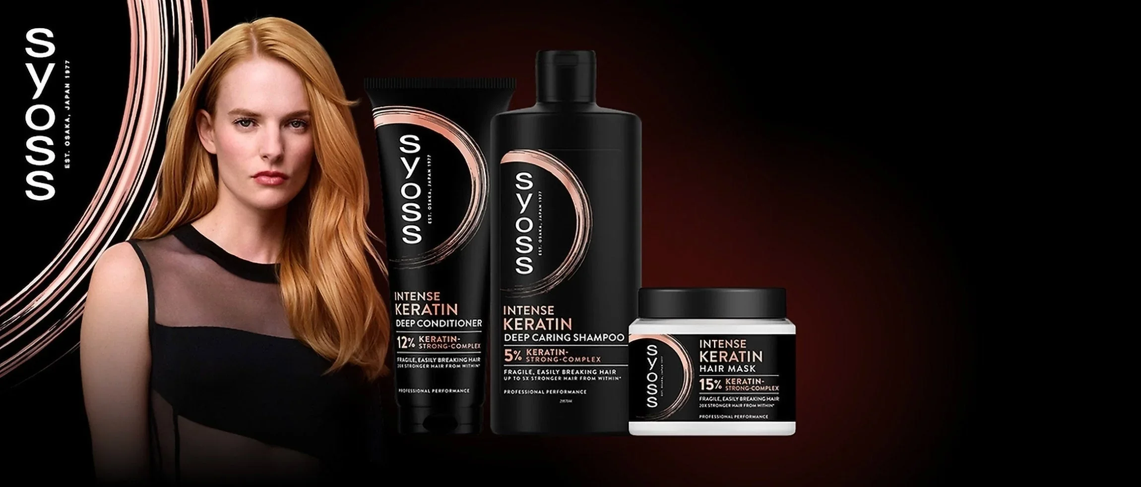 Syoss makes keratin affordable. Their Intense Keratin range boosts strength up to 5x and adds serious shine. Shampoo, conditioner, masks – all of the main haircare products. They even offer keratin-infused sty