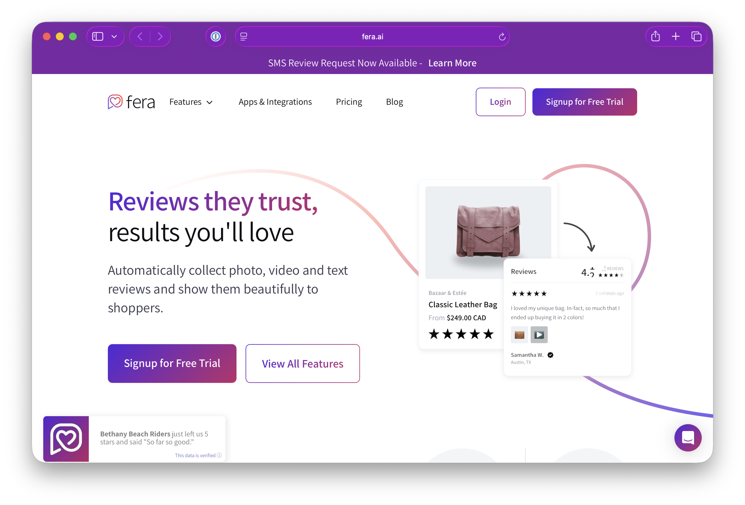 For beauty brands, where credibility is everything, Fera.ai makes it easy to highlight real results. You can showcase star ratings, written reviews, photo submissions, and even real-time purchase notifications that show shoppers your products are actively being bought and loved.