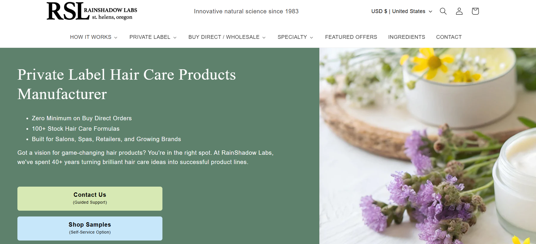 If naturally derived ingredients sit at the center of your brand vision, RainShadow Labs will likely feel aligned. Botanicals influence much of their formulation approach, which is why many clean beauty founders pause here while researching manufacturers.