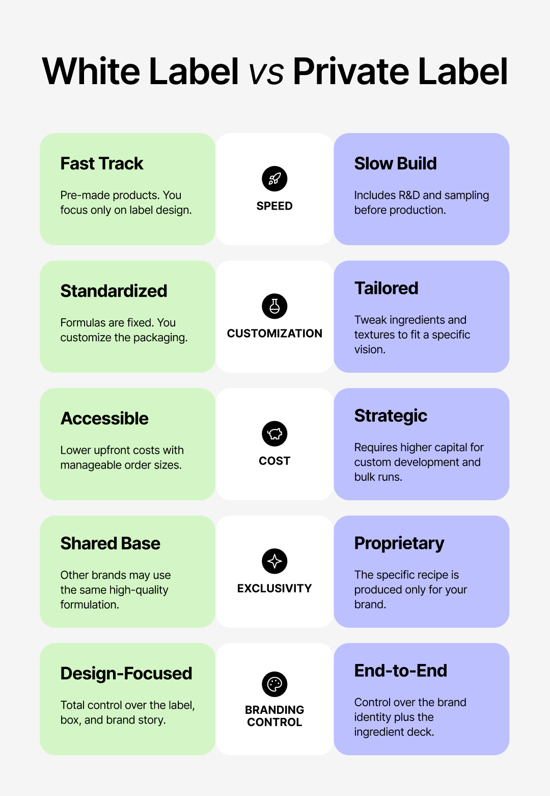 Limited differentiation: Since the formulas are pre-developed, your branding and storytelling have to do the heavy lifting. While customers rarely notice shared formulas, your unique brand identity is what will truly set you apart.