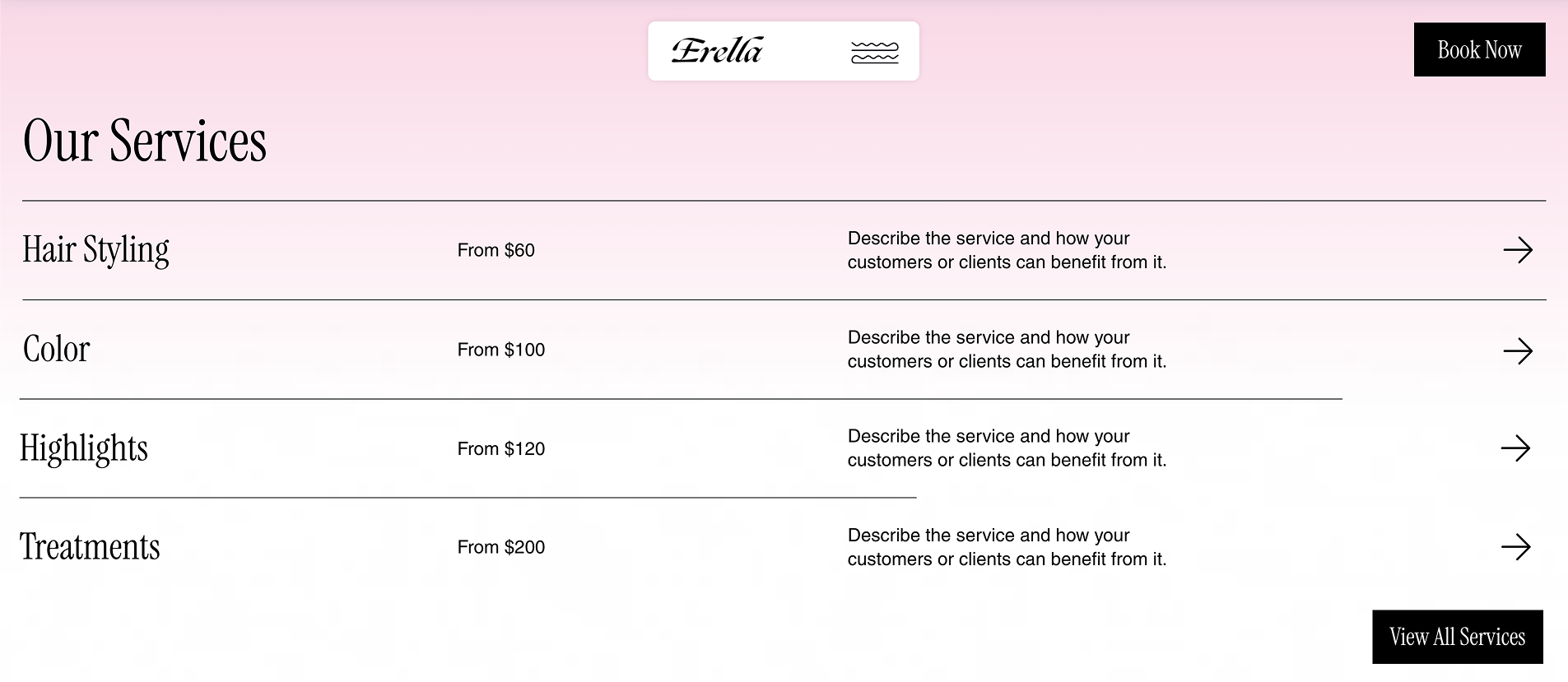 This minimalist list removes the fear of the unknown that often keeps new clients from booking. By listing specific categories like "hairstyling" and "color" alongside starting prices, you qualify your leads instantly.