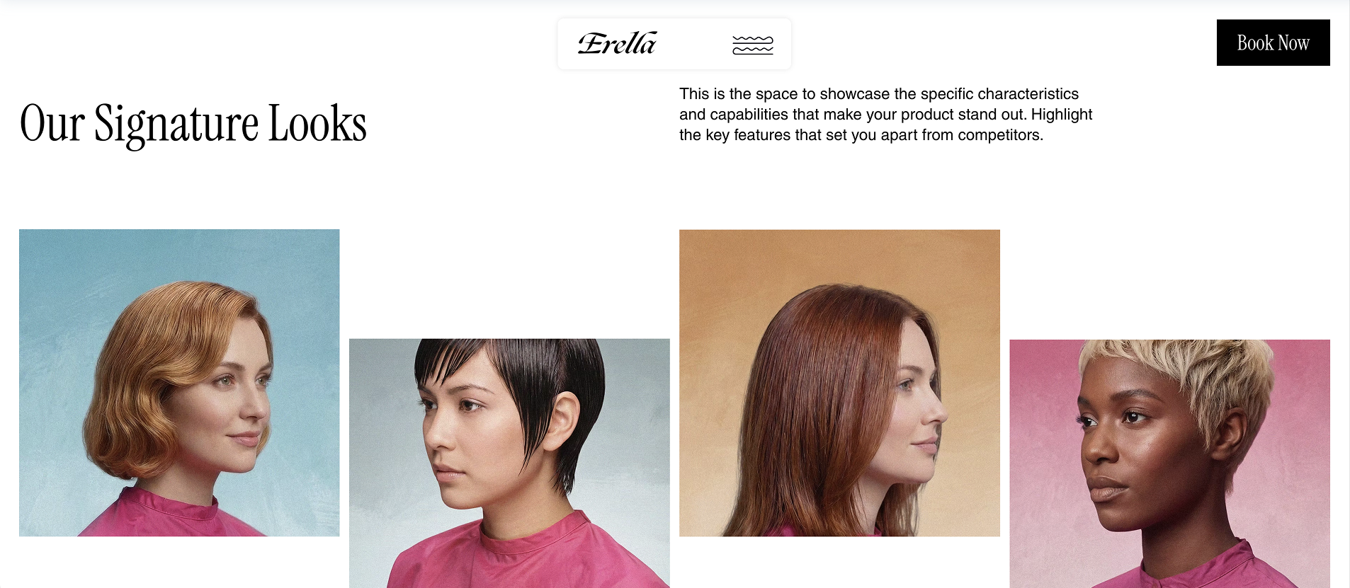 The "Book Now" button is the primary focal point; it’s designed to capture the visitor's intent the moment they land. You can customize this by swapping the hair shot for your best signature look to instantly define your specialty.